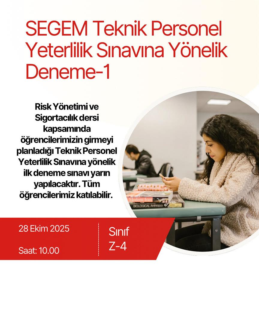 28 Ekim 2025 (Salı) günü saat 10.00’da, Z-4 numaralı sınıfta ilk deneme sınavı gerçekleştirilecektir. Bu sınavda, Risk Yönetimi ve Sigortacılık dersinde sınava yönelik olarak işlenen konulara ilişkin öğrencilerin bilgi düzeyi ölçülecektir.